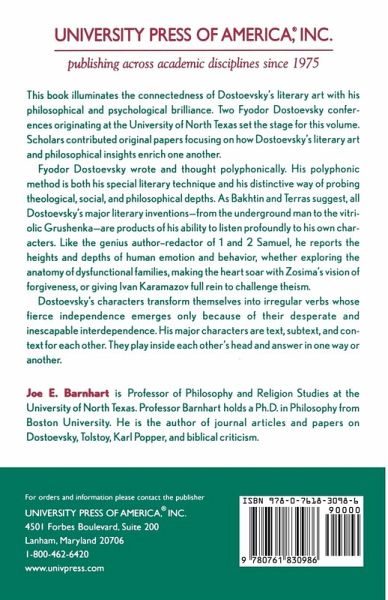 This book illuminates the connectedness of Dostoevsky's literary art with his philosophical and psychological brilliance. Two Fyodor Dostoevsky conferences originating at the University of North Texas set the stage for this volume. Scholars contributed original papers focusing on how Dostoevsky's literary art and philosophical insights enrich one another. Fyodor Dostoevsky wrote and thought polyphonically. His polyphonic method is both his special literary technique and his distinctive way of probing theological, social, and philosophical depths. As Bakhtin and Terras suggest, all Dostoevsky's major literary inventions-from the underground man to the vitriolic Grushenka-are products of his ability to listen profoundly to his own characters. Like the genius author-redactor of 1 and 2 Samuel, he reports the heights and depths of human emotion and behavior, whether exploring the anatomy of dysfunctional families, making the heart soar with Zosima's vision of forgiveness, or giving Ivan Karamazov full rein to challenge theism. Dostoevsky's characters transform themselves into irregular verbs whose fierce independence emerges only because of their desperate and inescapable interdependence. His major characters are text, subtext, and context for each other. They play inside each other's head and answer in one way or another.