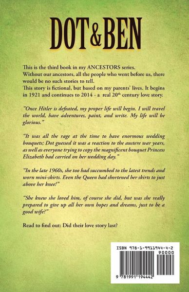 What do you know about your ancestors? This book, the third one in the ANCESTORS series is based on the lives of the authors parents. Dot and Ben were born in the 1920's, lived and fought in WW2 and their story continues until 2014. What was their day to day life like? Did their love survive? "Once Hitler is defeated, my proper life will begin. I will travel the world, have adventures, paint and write. My life will be glorious." "It was all the rage to have enormous wedding bouquets, Dot guessed it was a reaction to the austere war years, as well as everyone trying to copy the magnificent bouquet Princess Elizabeth had carried on her wedding day." Read now to find out if their love story lasted?