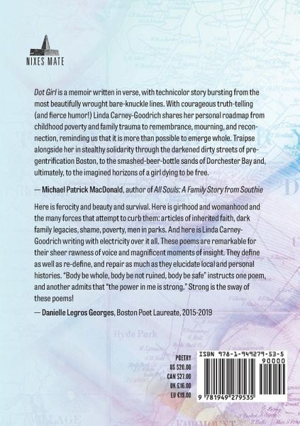 Dot Girl is a memoir written in verse, with technicolor story bursting from the most beautifully wrought bare-knuckle lines. With courageous truth-telling (and fierce humor!) Linda Carney-Goodrich shares her personal roadmap from childhood poverty and family trauma to remembrance, mourning, and reconnection, reminding us that it is more than possible to emerge whole. Traipse alongside her in stealthy solidarity through the darkened dirty streets of pre-gentrification Boston, to the smashed-beer-bottle sands of Dorchester Bay and, ultimately, to the imagined horizons of a girl dying to be free. - Michael Patrick MacDonald, author of All Souls: A Family Story from Southie