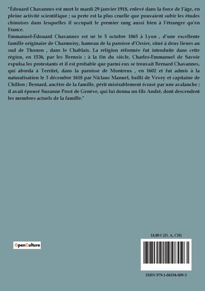 Édouard Chavannes1, né à Lyon le 5 octobre 1865 et mort à Paris le 29 janvier 1918, est un archéologue et sinologue français. Grand expert de l'histoire de la Chine et des religions chinoises, il est connu pour sa traduction de la plus grande partie du Shiji (¿¿ / ¿¿, Sh¿jì) de Sima Qian, qui est la première traduction de cet ouvrage dans une langue européenne. Érudit prolifique et influent, Chavannes fut l¿un des sinologues les plus accomplis de l¿ère moderne et, malgré son décès relativement précoce en 1918 à l'âge de 52 ans, est le digne successeur des grands noms de la sinologie française du xixe siècle, tels que Jean-Pierre Abel-Rémusat et Stanislas Julien. C'est en grande partie grâce à son travail que la sinologie est devenue une discipline respectée au sein des sciences humaines françaises. "Édouard Chavannes est mort le mardi 29 janvier 1918, enlevé dans la force de l¿âge, en pleine activité scientifique ; sa perte est la plus cruelle que pouvaient subir les études chinoises dans lesquelles il occupait le premier rang aussi bien à l¿étranger qüen France. Emmanuel-Édouard Chavannes est né le 5 octobre 1865 à Lyon , d¿une excellente famille originaire de Charmoisy, hameau de la paroisse d¿Orsier, situé à deux lieues au sud de Thonon , dans le Chablais. La religion réformée fut introduite dans cette région, en 1536, par les Bernois ; à la fin du siècle, Charles-Emmanuel de Savoie expulsa les protestants et il est probable que parmi eux se trouvait Bernard Chavannes, qui aborda à Territet, dans la paroisse de Montreux , en 1602 et fut admis à la naturalisation le 3 décembre 1618 par Niclaus Manuel, bailli de Vevey et capitaine de Chillon ; Bernard, ancêtre de la famille, périt misérablement écrasé par une avalanche ; il avait épousé Suzanne Prost de Genève, qui lui donna un fils André, dont descendent les membres actuels de la famille."