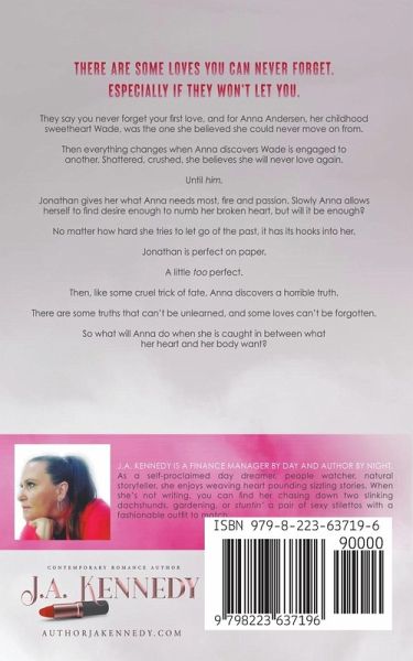 THERE ARE SOME LOVES YOU NEVER FORGET. ESPECIALLY IF THEY WON'T LET YOU. They say you never forget your first love,and for Anna Anderson, her childhood sweetheart Wade, was the one she believed she could never move on from. Then everything changes when Anna discovers Wade is engaged to another. Shattered, crushed, she believes she will never love again. Until him. Jonathan gives her what she needs most, fire and passion. Slowly Anna allows herself to find desire enough to numb her broken heart, but will it be enough? No matter how hard she tries to let go of the past, it has its hook into her. Jonathan is perfect on paper. A little too perfect. Then like some cruel trick of fate, Anna discovers a horrible truth. There are some truths that can't be unlearned, and some loves can't be forgotten. So what will Anna do when she is caught between what her heart and her body want?