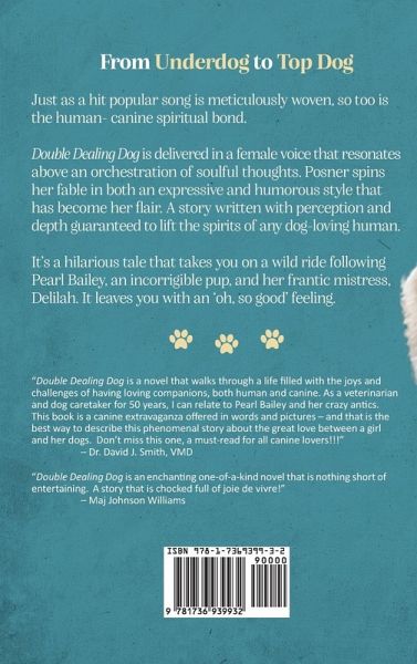 From Underdog to Top Dog Just as a hit popular song is meticulously woven, so too is the human-canine spiritual bond. Double Dealing Dog is delivered in a female voice that resonates above an orchestration of soulful thoughts. Posner spins her fable in both an expressive and humorous style that has become her fl air. A story written with perception and depth guaranteed to lift the spirits of any dog-loving human. It's a hilarious tale that takes you on a wild ride following Pearl Bailey, an incorrigible pup, and her frantic mistress, Delilah. It leaves you with an 'oh, so good' feeling.