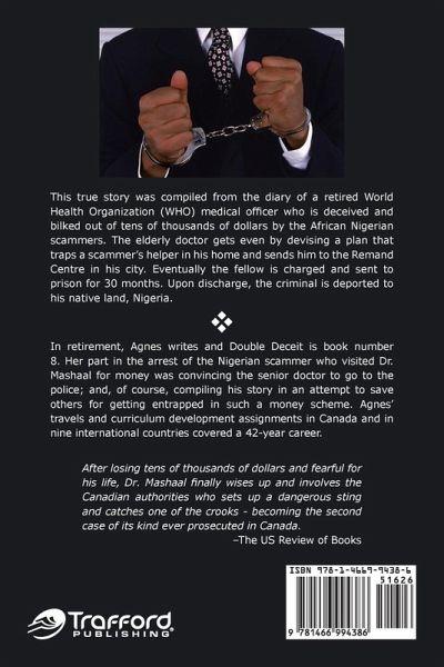 This true story was compiled from the diary of a retired World Health Organization (WHO) medical officer who is deceived and bilked out of tens of thousands of dollars by the African Nigerian scammers. The elderly doctor gets even by devising a plan that traps a scammer's helper in his home and sends him to the Remand Centre in his city. Eventually the fellow is charged and sent to prison for 30 months. Upon discharge, the criminal is deported to his native land, Nigeria. During his first year after having entered Canada as a refugee, he had been charged several times for misdemeanors.