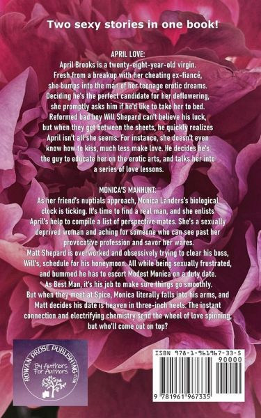 TWO SEXY STORIES IN ONE BOOK! APRIL LOVE: April Brooks is a twenty-eight-year-old virgin. Fresh from a breakup with her cheating ex-fiancé, she bumps into the man of her teenage erotic dreams. Deciding he's the perfect candidate for her deflowering, she promptly asks him if he'd like to take her to bed. Reformed bad boy Will Shepard can't believe his luck, but when they get between the sheets, he quickly realizes April isn't all she seems. For instance, she doesn't even know how to kiss, much less make love. He decides he's the guy to educate her on the erotic arts, and talks her into a series of love lessons. Will April be able to put aside her distrust of men to find pleasure in Will's arms, and can he teach her all his favorite tricks without falling in love? MONICA'S MANHUNT: As her friend's nuptials approach, Monica Landers's biological clock is ticking. It's time to find a real man, and she enlists April's help to compile a list of perspective mates. She's a sexually deprived woman and aching for someone who can see past her provocative profession and savor her wares. Matt Shepard is overworked and obsessively trying to clear his boss, Will's, schedule for his honeymoon. All while being sexually frustrated, and bummed he has to escort Modest Monica on a duty date. As Best Man, it's his job to make sure things go smoothly. But when they meet at Spice, Monica literally falls into his arms, and Matt decides his date is heaven in three-inch heels. The instant connection and electrifying chemistry send the wheel of love spinning, but who'll come out on top?