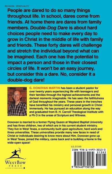 People are dared to do so many things throughout life. In school, dares come from friends. At home there are dares from family members. Double-Dog Dare is about hard choices people need to make every day to grow in Christ in the middle of life with family and friends. These forty dares will challenge and stretch the individual beyond what can be imagined. Each one has the potential to impact a person and those in their closest circles of life. It won't be an easy journey, but consider this a dare. No, consider it a double-dog dare!