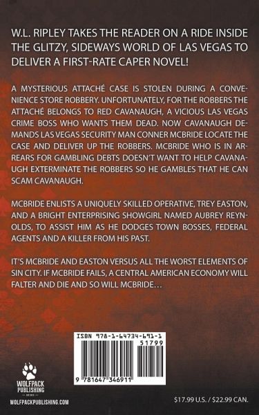 W.L. Ripley takes the reader on a ride inside the glitzy, sideways world of Las Vegas to deliver a first-rate caper novel! A mysterious attaché case is stolen during a convenience store robbery. Unfortunately, for the robbers the attaché belongs to Red Cavanaugh, a vicious Las Vegas crime boss who wants them dead. Now Cavanaugh demands Las Vegas security man Conner McBride locate the case and deliver up the robbers. McBride who is in arrears for gambling debts doesn't want to help Cavanaugh exterminate the robbers so he gambles that he can scam Cavanaugh. McBride enlists a uniquely skilled operative, Trey Easton, and a bright enterprising showgirl named Aubrey Reynolds, to assist him as he dodges town bosses, federal agents and a killer from his past. It's McBride and Easton versus all the worst elements of Sin City. If McBride fails, a Central American economy will falter and die and so will McBride…