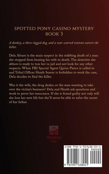 Spotted Pony Casino Mystery Book 3 A donkey, a three-legged dog, and a war-scarred veteran outwit the killer. Dela Alvaro is the main suspect in the stabbing death of a man she stopped from beating his wife to death. The detective she abhors is ready to toss her in jail and not look for any other suspects. When FBI Special Agent Quinn Pierce is called in and Tribal Officer Heath Seaver is forbidden to work the case, Dela decides to find the killer. Was it the wife, the drug dealer, or the man wanting to take over the victim's business? Dela and Heath ask questions and work to prove her innocence. If she is found guilty not only will she lose her new life but she'll never be able to solve the secret of her father.