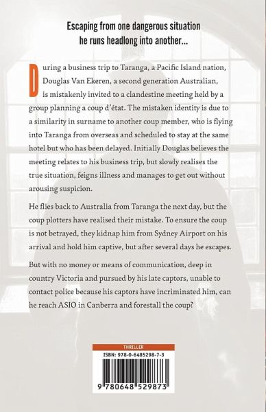 During a business trip to Taranga, a Pacific Island nation, Douglas Van Ekeren, a second generation Australian, is mistakenly invited to a clandestine meeting held by a group planning a coup d'état. The mistaken identity is due to a similarity in surname to another coup member, who is flying into Taranga from overseas and scheduled to stay at the same hotel but who has been delayed. Initially Douglas believes the meeting relates to his business trip, but slowly realises the true situation, feigns illness and manages to get out without arousing suspicion. He flies back to Australia from Taranga the next day, but the coup plotters have realised their mistake. To ensure the coup is not betrayed, they kidnap him from Sydney Airport on his arrival and hold him captive, but after several days he escapes. But with no money or means of communication, deep in country Victoria and pursued by his late captors, unable to contact police because his captors have incriminated him, can he reach ASIO in Canberra and forestall the coup?