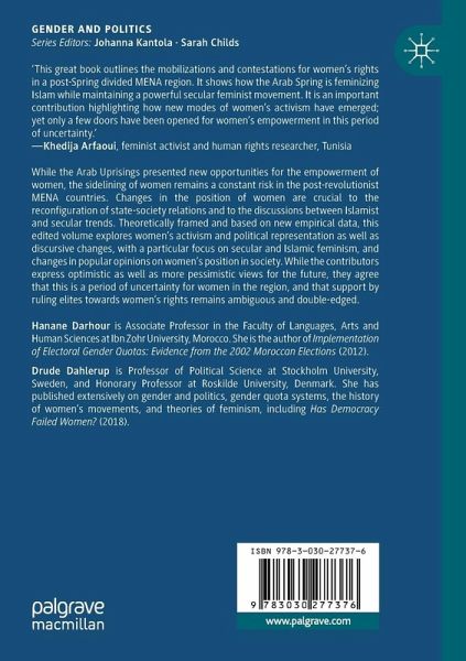 1. Introduction: The Arab Uprisings and the Rights of Women (Drude DAHLERUP and Hanane DARHOUR).- Part I: Women's Rights, Feminism and Islamism.- 2. The Center: A Theoretical Framework for Understanding Women's Rights in Pre- and Post-Arab Spring North Africa (Fatima SADIQI).- 3. Whose Gender Equality? On the Boundaries of Islam and Feminism in the MENA Region (Ilyass BOUZGHAIA).- Part II: Post-Spring Dynamics and Feminist Norm Diffusion.- 4. Cultural Change in North Africa: the Interaction Effect of Women's Empowerment and Democratization (Ginger FEATHER).- 5. Changing Tides? On How Popular Support for Feminism increased after the Arab Spring (Saskia GLAS and Niels SPIERINGS).- Part III: Women's Activism and the Reconfigured State.- 6. Women's Activism in North Africa in Post Arab Spring (Moha ENNAJI).- 7. Political Opportunities for Islamist Women in Morocco and Egypt (Anwar MHAJNE).- 8. Contrasting Women's Rights in the Maghreb and the Middle East Constitutions (Aili Mari TRIPP).- Part IV: Empowered or Sidelined? On Women's Political Representation and Influence.- 9. Examining Female Membership and Leadership of Legislative Committees in Jordan (Marwa SHALABY and Laila ELIMAM).- 10. Empowering young women? Gender and youth quotas in Tunisia (Jana BELSCHNER).- 11. Whose Empowerment? Gender Quota Reform Mechanisms and De-democratization in Morocco (Hanane DARHOUR).