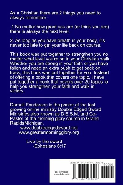 As a Christian there are 2 things you need to always remember 1.No matter how great you are (or think you are) there is always the next level. 2. As long as you have breath in your body, it's never too late to get your life back on course. This book was put together to strengthen you no matter what level you're on in your Christian walk. Whether you are strong in your faith or you have fallen and need an extra push to get back on track, this book was put together for you. Instead of offering a book that covers one topic, I have put together a book that covers over 20 topics to help you strengthen your faith and walk in victory.