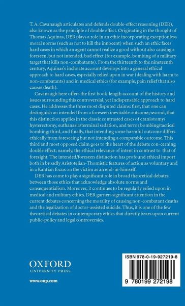 T. A. Cavanaugh defends double-effect reasoning (DER), also known as the principle of double effect. DER plays a role in anti-consequentialist ethics (such as deontology), in hard cases in which one cannot realize a good without also causing a foreseen, but not intended, bad effect (for example, killing non-combatants when bombing a military target). This study is the first book-length account of the history and issues surrounding this controversial approach to hard cases. It will be indispensable in theoretical ethics, applied ethics (especially medical and military), and moral theology. It will also interest legal and public policy scholars.