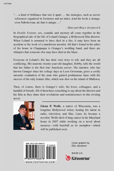 After a film director dies in a mysterious fire, there is more than one side to the story of his life. Movie director Leland Granger sought acclaim his entire life, but only achieved his goal after his death. His sole feature film is released posthumously, and his daughter Debby pens a biography to establish her father's status as an auteur, despite the efforts of those, she contends, who undermined him. However, Leland's longtime friend Paul Garvey sees things differently. Paul levies his judgment upon the biography, while sharing his perspective on the man he had known since college, when he was just the asthmatic, eccentric Leon Grossman from Milwaukee. While Debby's sensationalist, pretentious tell-all, The Celluloid Umbilical, is widely panned and revealed to be largely fictional, Paul provides particular insight into her flights of fancy, having been present at many of the events she describes. His motive in debunking Debby's book isn't simply devotion to the truth or his friend's memory-he's defending himself and others against the character assassination she undertakes, which goes so far as to implicate him in the fire that killed her parents. The narrative is a deliciously sarcastic tale, packed with Hollywood history told from an insider's viewpoint, but the language is often too clever for its own good. Wolfe throws himself wholeheartedly into his novel's conceit, even supplying numerous footnotes citing Debby's fictional biography and those of other figures involved, as well as an index. But the meta-fictional premise, which brings Paul Auster to mind, isn't quite sufficient enough to sustain the reader's interest for 300 pages. The book ultimately ends with an unsatisfying whimper. Adding to the post-modern resonance, Double Feature has been published posthumously; Wolfe, a longtime Hollywood writer, died in 2007. A Hollywood whodunit told in compelling, if at times verbose, style.-Kirkus Discoveries