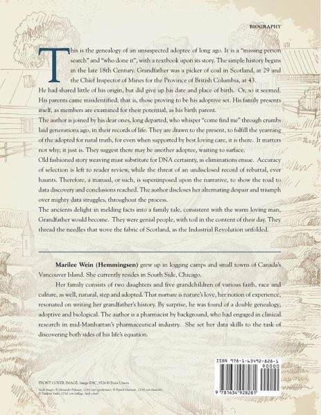 Surprise adoptee, Grandfather was a coal picker in Scotland, at 29, and Chief Inspector of Mines for British Columbia, at 43. He had shared his date and place of birth, or so, it seemed. This genealogy embraces late 18th to early 20th Century, Scotland, with US implications. His family is lovingly presented in "who done it", under evaluation, as his potential birth parents. His dearly departed are drawn to present, fulfilling adoptee yearn for natal truth. They join "missing person" searches, through crumbs laid long ago, in their records of life. Their whispered lifelines include a wrench; a same aged, unrelated, adopted cousin, awaiting discovery. Old fashioned story weaving substitutes for DNA certainty, as eliminations ensue. The road to data discovery and conclusion is superimposed upon the narrative. Accuracy of selection is left to reader speculation, while threat of an undisclosed record of rebuttal, ever haunts. Author despair and triumph, over mighty data struggles, is disclosed throughout. Ancestors meld facts into a family tale, consistent with the beloved man, Grandfather would become. They were genial people, with toil in the content of their day. They thread the needles that wove the fabric of Scotland, as the Industrial Revolution unfolded.