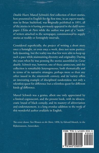 Double Heart, Marcel Schwob's first collection of short stories, here presented in English for the first time, in an expert translation by Brian Stableford, was originally published in 1891, all of the stories in it having previously appeared in the daily newspaper L'Écho de Paris while the author was part of a "stable" of writers attached to the newspaper, commissioned to supply stories at weekly or fortnightly intervals. Considered superficially, the project of writing a short story once a fortnight, or even once a week, does not seem particularly daunting, but the reality was that few were able to keep up such a pace while maintaining diversity and originality. During the years when he was penning the stories assembled in Coeur double, Schwob was, however, one of those aristocrats, and the collection is remarkably heterogeneous, both thematically and in terms of its narrative strategies, perhaps more so than any other issued in the nineteenth century, and its variety offers an interesting example of disciplined randomness: not only a relentless quest for difference but a relentless quest for different kinds of difference. Marcel Schwob was a genius, albeit one only appreciated by a limited cognoscenti, and the present book, with its idiosyncratic brand of black comedy, and its mastery of abbreviation and understatement, is a long overdue addition to the work of this wonderful author available in English.