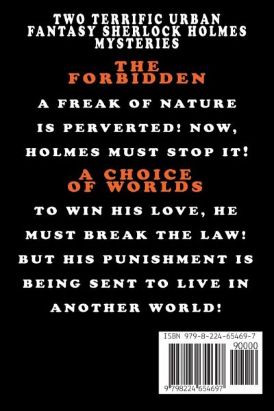 TWO MORE TERRIFIC READS IN THE FANTASTIC NEW SHERLOCK HOLMES URBAN FANTASY MYSTERY SERIES. THE FORBIDDEN HE BROKE THE LAWS OF NATURE AND HUMANITY, AND NOW LONDON WILL HAVE TO PAY FOR IT. THE CHOICE OF WORLDS JAMES MORIARTY HAS TWO CHOICES. 1. BREAK THE LAW AND SAVE HIS PENDING MARRIAGE...OR 2. LOSE HIS HONOR AND THE WOMAN HE LOVES. WHAT HE DID NOT REALIZE WAS THAT THIS NIGHT HE WILL BE GIVEN ANOTHER CHOICE... ONE THAT WILL TAKE HIM TO ANOTHER UNIVERSE WHERE SHERLOCK HOLMES LIVES AND HIS BITTER ENEMY, PROFESSOR MORIARTY....A MAN THAT JAMES LOOKS LIKE ALSO LIVES. AN EXCITING NEW TAKE ON THE HOLMES LEGENDARY MYSTERIES.