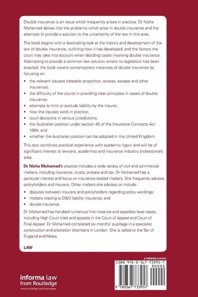 Double insurance is an issue which frequently arises in practice. Dr Nisha Mohamed delves into the problems which arise in double insurance and the attempts to provide a solution to the uncertainty of the law in this area.¿ The book begins with a fascinating look at the history and development of the law of double insurance, outlining how it has developed, and the factors the court may take into account when deciding cases involving double insurance. Attempting to provide a common law solution where no legislation has been enacted, the book covers contemporary instances of double insurance by focusing on:¿ the relevant clauses (rateable proportion, excess, escape and other insurance) the difficulty of the courts in providing clear principles in cases of double insurance attempts to limit or exclude liability by the insurer how the clauses work in practice court decisions in various jurisdictions the Australian position under section 45 of the Insurance Contracts Act 1984 whether the Australian position can be adopted in the United Kingdom This text combines practical experience with academic rigour and will be of significant interest to lawyers, academics and insurance industry professionals alike.