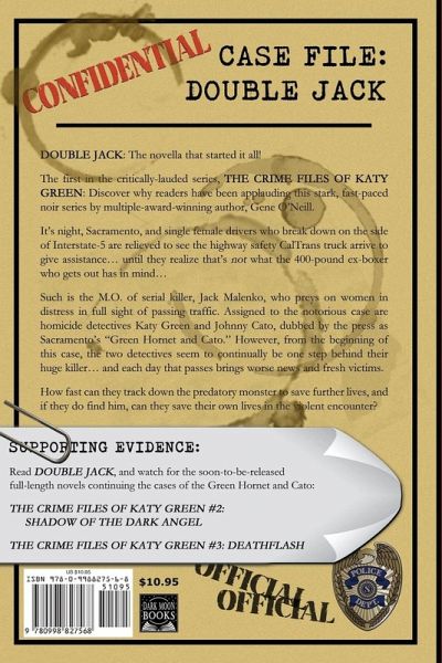 DOUBLE JACK, book #1 in the series, THE CRIME FILES OF KATY GREEN The novella that started it all! It's night, Sacramento, and single female drivers who break down on the side of Interstate-5 are relieved to see the highway safety CalTrans truck arrive to give assistance… until they realize that's not what the 400-pound ex-boxer who gets out has in mind… Such is the M.O. of serial killer, Jack Malenko, who preys on women in distress in full sight of passing traffic. Assigned to the notorious case are homicide detectives Katy Green and Johnny Cato, dubbed by the press as Sacramento's "Green Hornet and Cato." However, from the beginning of this case, the two detectives seem to continually be one step behind their huge killer… and each day that passes brings worse news and fresh victims. How fast can they track down the predatory monster to save further lives, and if they do find him, can they save their own lives in the violent encounter? Discover why readers have been applauding this stark, fast-paced noir series by multiple-award-winning author, Gene O'Neill! And don't miss out on the other thrilling books in this series: THE CRIME FILES OF KATY GREEN #1: DOUBLE JACK (a novella) THE CRIME FILES OF KATY GREEN #2: SHADOW OF THE DARK ANGEL THE CRIME FILES OF KATY GREEN #3: DEATHFLASH THE CRIME FILES OF KATY GREEN #4: A STICK OF DOUBLEMINT