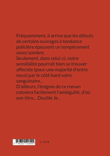 Fréquemment, il arrive que les débuts de certains ouvrages à tendance policière épousent un tempérament assez sombre. Seulement, dans celui-ci, notre sensibilité pourrait bien se trouver affectée (pour une majorité d'entre nous) par le côté hard voire sanguinaire... D'ailleurs, l'énigme de ce roman cotoiera facilement l'ambiguïté, d'où son titre... Double Je...