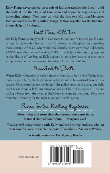 The first two books in the national bestselling Knitting mysteries- Knit One, Kill Two and Needled to Death. In Knit One, Kill Two, Kelly Flynn returns to Colorado for her aunt's funeral only to suspect that the woman's death was not an accident. With the help of the knitting regulars at House of Lambspun, Kelly's about to get a few lessons in creating a sumptuously colored scarf-and in luring a killer out of hiding. In Needled to Death, Kelly visits her friend Vickie's alpaca farm, and finds her splayed out on her original hand-woven rug, blood seeping into the design. Kelly can't resist investigating-even if it means taking a break from the sweater she's been knitting in the round.