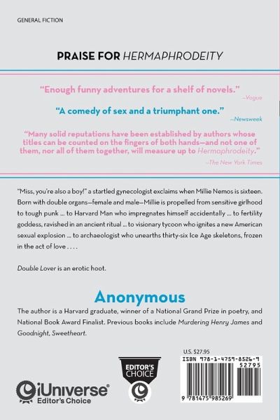 "Miss, you're also a boy!" exclaims a startled gynecologist when Millie Nemos is sixteen. Her poetic memoirs, with extraordinary sexual recollections, reveal a life propelled from a sensitive girl who wants only her brother's love, to a Harvard Man who impregnates himself by accident, to a controversial archaeologist who finds Ice Age skeletons in scandalous positions, to a double-sexed CEO who wants the whole country's love. Double Lover is a hoot-an erotic comedy-"a ribald, hugely entertaining tale of sexual encounters and torrid love affairs in far-flung locales... Wanders hilariously all over the sexual landscape."* *Kirkus Review