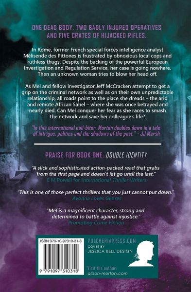 She's hunting arms smugglers. But who is hunting her? One dead body, two badly injured operatives and five crates of hijacked rifles. In Rome, former French special forces intelligence analyst Mélisende des Pittones is frustrated by obnoxious local cops and ruthless thugs. Despite the backing of the powerful European Investigation and Regulation Service, her case is going nowhere. Then an unknown woman tries to blow her head off. As Mel and fellow investigator Jeff McCracken attempt to get a grip on the criminal network as well as on their own unpredictable relationship, all roads point to the place she dreads - the arid and remote African Sahel - where she was once betrayed and nearly died. Can Mel conquer her fear as she races to smash the network and save her colleague's life?