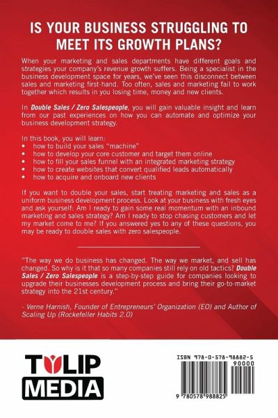 Is your business struggling to meet its growth plans? When your marketing and sales departments have different goals and strategies your company's revenue growth suffers. Being a specialist in the business development space for years, we've seen this disconnect between sales and marketing first-hand. Too often, sales and marketing fail to work together which results in you losing time, money and new clients. In Double the Sales / Zero the Salespeople, you will gain valuable insight and learn from our past experiences on how you can automate and optimize your business development strategy. In this book, you will learn:how to build your sales "machine" how to develop your core customer and target them online how to fill your sales funnel with an integrated marketing strategy how to create websites that convert qualified leads automatically how to acquire and onboard new clients If you want to double your sales, start treating marketing and sales as a uniform business development process. Look at your business with fresh eyes and ask yourself: Am I ready to gain some real momentum with an inbound marketing and sales strategy? Am I ready to stop chasing customers and let my market come to me? If you answered yes to any of these questions, you may be ready to double sales with zero salespeople.