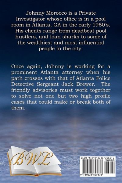 Johnny Morocco is a Private Investigator whose office is in a pool room in Atlanta, GA in the early 1950's. His clients range from deadbeat pool hustlers, and loan sharks to some of the wealthiest and most influential people in the city. : Once again, Johnny is working for a prominent Atlanta attorney when his path crosses with that of Atlanta Police Detective Sergeant Jack Brewer. The friendly advisories must work together to solve not one but two high profile cases that could make or break both of them.
