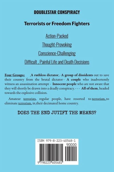 DOUBLESTAR CONSPIRACY Doublestar Conspiracy asks the question: "ARE THEY FREEDOM FIGHTERS OR TERRORISTS?" in a novel packed with action and loaded with plot twists. A group of dissidents are dedicated to liberating their homeland from the terror of a brutal dictator. They now have what may be their only chance while he is visiting the United States. They are desperate people willing to go to great extremes. However, many innocent people become entangled in the web of conspiracy. All involved must dig deep into their bag of survival skills. The dissidents are not professionals, just everyday people brought together in a common cause. The result: Many thought-provoking; soul-searching; conscience-challenging; painful life and death decisions. DOES THE END JUSTIFY THE MEANS?
