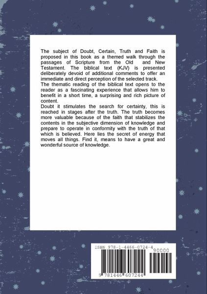 The subject of Doubt, Certain, Truth and Faith, based on the research topics conducted by Fernand D'Amico and Jacques Wisman, is proposed in this book as a themed walk through the passages of Scripture from the Old and New Testament. The biblical text (KJV) is presented deliberately devoid of additional comments to offer an immediate and direct perception of the selected track. The thematic reading of the biblical text opens to the reader as a fascinating experience that allows him to benefit in a short time, a surprising and rich picture of content. Doubt it stimulates the search for certainty, this is reached in stages after the truth. The truth becomes more valuable because of the faith that stabilizes the contents in the subjective dimension of knowledge and prepare to operate in conformity with the truth of that which is believed. Here lies the secret of energy that moves all things. Find it, means to have a great and wonderful source of knowledge.