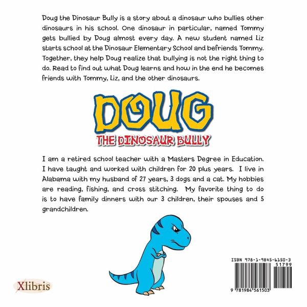 Doug the Dinosaur Bully is a story about a dinosaur who bullies other dinosaurs in his school. One dinosaur in particular, named Tommy gets bullied by Doug almost every day. A new student named Liz starts school at the Dinosaur Elementary School and befriends Tommy. Together, they help Doug realize that bullying is not the right thing to do. Read to find out what Doug learns and how in the end he becomes friends with Tommy, Liz, and the other dinosaurs.