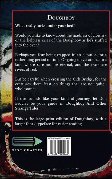 What really lurks under your bed? Would you like to know about the madness of clowns - or the helpless cries of the Doughboy as he's stuffed into the oven? Perhaps you fear being trapped in an elevator...for a rather long period of time. Or going on vacation... to a land where screams are eternal, and the tears are rivers of red. But be careful when crossing the Cith Bridge, for the creatures there feast on things that are not quite... wholesome. If this sounds like your kind of journey, let Don Broyles be your guide in Doughboy And Other Strange Tales. This is the large print edition of Doughboy, with a larger font / typeface for easier reading. This book contains graphic violence and is not suitable for readers under the age of 18.