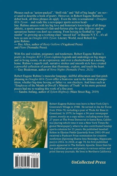With fire and wisdom, poignancy and tenderness, Robert Eugene Rubino's poetry in Douglas KO's Tyson explores legends and underdogs on big stages and in living rooms, on an expressway and over a checkerboard at a nursing home. Rubino's superb craft, narrative strokes and smooth style have created a powerful collection of poems that illuminate, explore, and touch the heart. - Guy Biederman, author of Nova Nights (Nomadic Press, 2021)