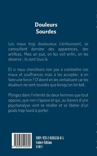 Les maux trop douloureux s'enfouissent, se camouflent derrière des apparences, des artifices. Mais un jour, on les voit enfin, on les observe. Et si nous cherchions non pas à combattre ces maux et souffrances mais à les accepter, à en faire une force ? D'abord en les verbalisant car les douleurs ne sont sourdes que lorsqu'on les tait. Plongez dans l'intimité de deux femmes que tout oppose, que rien n'apaise et qui, au travers d'une psychanalyse vont se révéler et se libérer d'un poids trop lourd à porter.