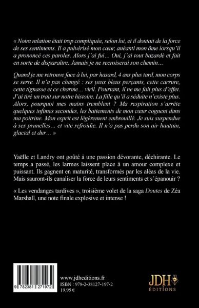 "Notre relation était trop compliquée, selon lui, et il doutait de la force de ses sentiments. Il a pulvérisé mon c¿ur, anéanti mon âme lorsqu'il a prononcé ces paroles. Alors j'ai fui¿ Oui, j'ai tout bazardé et fait en sorte de disparaître. Jamais je ne recroiserai son chemin¿ Quand je me retrouve face à lui, par hasard, 4 ans plus tard, mon corps se serre. Il n'a pas changé : ses yeux bleus perçants, cette carrure, cette tignasse et ce charme¿ viril. Pourtant, il ne me fait plus d'effet. J'ai tiré un trait sur notre histoire. La fille qu'il a séduite n'existe plus. Alors, pourquoi mes mains tremblent ? Ma respiration s'arrête quelques infimes secondes, les battements de mon c¿ur cognent dans ma poitrine. Mon esprit est légèrement embrouillé. Je suis suspendue à ses prunelles¿ et vite refroidie. Il n'a pas perdu son air hautain, glacial et dur¿" Yaëlle et Landry ont goûté à une passion dévorante, déchirante. Le temps a passé, les larmes laissent place à un amour complexe et puissant. Ils gagnent en maturité, transformés par les aléas de la vie. Mais sauront-ils canaliser la force de leurs sentiments et s'épanouir ? "Les vendanges tardives", troisième volet de la saga "Doutes" de Zéa Marshall, une note finale explosive et intense !