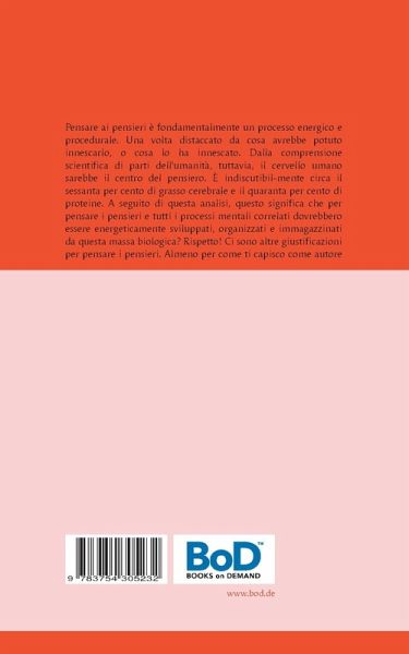 Pensare ai pensieri è fondamentalmente un processo energico e procedurale. Una volta distaccato da cosa avrebbe potuto innescarlo, o cosa lo ha innescato. Dalla comprensione scientifica di parti dell'umanità, tuttavia, il cervello umano sarebbe il centro del pensiero. È indiscutibil-mente circa il sessanta per cento di grasso cerebrale e il quaranta per cento di proteine. A seguito di questa analisi, questo significa che per pensare i pensieri e tutti i processi mentali correlati dovrebbero essere energeticamente sviluppati, organizzati e immagazzinati da questa massa biologica? Rispetto! Ci sono altre giustificazioni per pensare i pensieri. Almeno per come ti capisco come autore di questo romanzo.