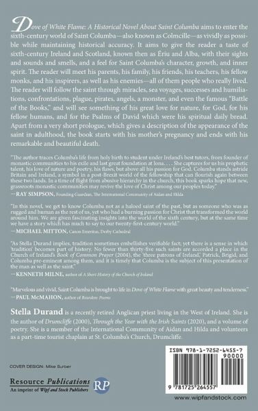 Dove of White Flame: A Historical Novel About Saint Columba aims to enter the sixth-century world of Saint Columba--also known as Colmcille--as vividly as possible while maintaining historical accuracy. It aims to give the reader a taste of sixth-century Ireland and Scotland, known then as Eriu and Alba, with their sights and sounds and smells, and a feel for Saint Columba's character, growth, and inner spirit. The reader will meet his parents, his family, his friends, his teachers, his fellow monks, and his inspirers, as well as his enemies--all of them people who really lived. The reader will follow the saint through miracles, sea voyages, successes and humiliations, confrontations, plague, pirates, angels, a monster, and even the famous ""Battle of the Books,"" and will see something of his great love for nature, for God, for his fellow humans, and for the Psalms of David which were his spiritual daily bread. Apart from a very short prologue, which gives a description of the appearance of the saint in adulthood, the book starts with his mother's pregnancy and ends with his remarkable and beautiful death.