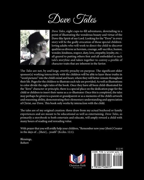 Dove Tales, eight cups-to-fill adventures, dovetailing to a point of illustrating the wondrous beauty and virtue of the Dove-like Spirit of our Lord. Looking for the "Dove" in every story will be the godly avocation of those special children-loving adults who will work to direct the child to discover qualities as diverse as heroism, courage, self-sacrifice, humor, wonder, kindness, respect, duty, love, empathy, loyalty, etc.-all geared to putting others first and all embedded in each tale's storyline and taken together to convey a profile of character traits that are inherent in the Savior. The Tales are not, by and large, overtly preachy on purpose. The significant older sponsor(s) working interactively with the children will be able to layer these truths in "word pictures" into the child's mind and heart, where they will better remain throughout their life. Pages for the children to illustrate each tale are provided; As well as illustrations to color divide the eight tales of the book. Once they have all been child-illustrated for the "dove" character or principle, there is a special place on the dedication page for the child or children to insert their name as a co-illustrator. Once this is completed, the tales may perhaps be given to a parent or grandparent or as a memento of the child's artwork and reasoning ability, demonstrating their elementary understanding and appreciation of Christ, our Dove. This book only works by interaction with the child. The tales are of my original creation: three draw from my actual boyhood or family experiences and are meant to be educational as well as entertaining. Dove Tales, as primarily a storybook to both entertain and educate, will amply reward a child with many hours of reading and rereading value. With prayer that you will avidly help your children, "Remember now your [their] Creator in the days of ...[their]... youth" (Eccles. 12:1). Blessings, Robert