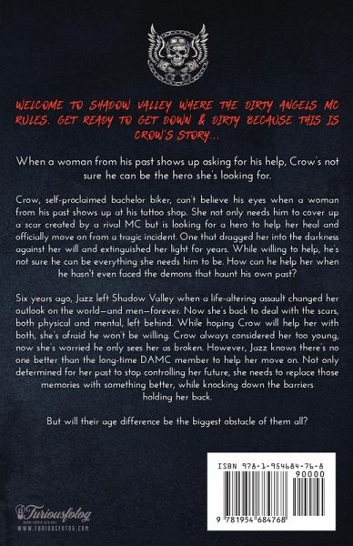Welcome to Shadow Valley where the Dirty Angels MC rules. Get ready to get Down & Dirty because this is Crow's story... When a woman from his past shows up asking for his help, Crow's not sure he can be the hero she's looking for. Crow, self-proclaimed bachelor biker, can't believe his eyes when a woman from his past shows up at his tattoo shop. She not only needs him to cover up a scar created by a rival MC but is looking for a hero to help her heal and officially move on from a tragic incident. One that dragged her into the darkness against her will and extinguished her light for years. While willing to help, he's not sure he can be everything she needs him to be. How can he help her when he hasn't even faced the demons that haunt his own past? Six years ago, Jazz left Shadow Valley when a life-altering assault changed her outlook on the world-and men-forever. Now she's back to deal with the scars, both physical and mental, left behind. While hoping Crow will help her with both, she's afraid he won't be willing. Crow always considered her too young, now she's worried he only sees her as broken. However, Jazz knows there's no one better than the long-time DAMC member to help her move on. Not only determined for her past to stop controlling her future, she needs to replace those memories with something better, while knocking down the barriers holding her back. But will their age difference be the biggest obstacle of them all? Note: Down & Dirty: Crow is the tenth book in the Dirty Angels MC series. It's highly recommended that you read this 10-book series in order. It has no cheating, no relationship cliffhanger and, as always, has an HEA.