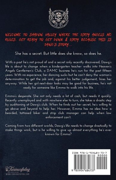 Welcome to Shadow Valley where the Dirty Angels MC rules. Get ready to get Down & Dirty because this is Dawg's story... She has a secret. But little does she know, so does he. With a past he's not proud of and a secret only recently discovered, Dawg's life is about to change when a kindergarten teacher walks into Heaven's Angels Gentlemen's Club, a DAMC business he's run for the past fifteen years. With no experience, her dancing sucks but he can't deny the woman's determination to get the job and, against his better judgement, hires her anyway. While her girl-next-door looks may be good for business, he's not ready for someone like Emma to walk into his life. Emma's desperate. She not only needs a lot of cash, but needs it quickly. Recently unemployed and with nowhere else to turn, she takes a drastic step by auditioning at Dawg's club. When he finds out her secret, he's willing to go above and beyond to help her. However, Emma has no idea how a bearded, tattooed biker and strip club manager can help when law enforcement can't. Coming from two different worlds, Dawg's life needs to change drastically to make things work, but is he willing to give up almost everything he's ever known for Emma? Note: Down & Dirty: Dawg is the seventh book in the Dirty Angels MC series. It's highly recommended that you read this 10-book series in order. It has no cheating, no relationship cliffhanger and, as always, has an HEA.