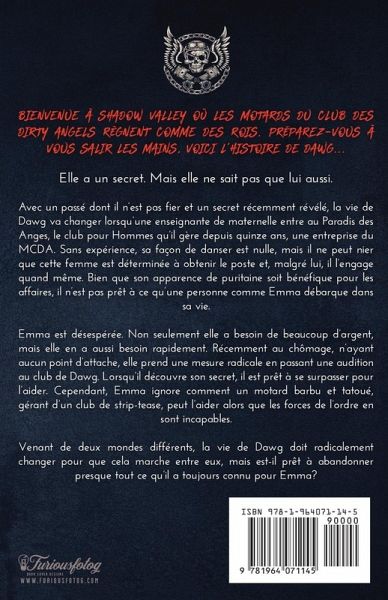 Bienvenue à Shadow Valley où les motards du club des Dirty Angels règnent comme des rois. Préparez-vous à vous salir les mains, voici l'histoire de Dawg... Elle a un secret. Mais elle ne sait pas que lui aussi. Avec un passé dont il n'est pas fier et un secret récemment révélé, la vie de Dawg va changer lorsqu'une enseignante de maternelle entre au Paradis des Anges, le club pour Hommes qu'il gère depuis quinze ans, une entreprise du MCDA. Sans expérience, sa façon de danser est nulle, mais il ne peut nier que cette femme est déterminée à obtenir le poste et, malgré lui, il l'engage quand même. Bien que son apparence de puritaine soit bénéfique pour les affaires, il n'est pas prêt à ce qu'une personne comme Emma débarque dans sa vie. Emma est désespérée. Non seulement elle a besoin de beaucoup d'argent, mais elle en a aussi besoin rapidement. Récemment au chômage, n'ayant aucun point d'attache, elle prend une mesure radicale en passant une audition au club de Dawg. Lorsqu'il découvre son secret, il est prêt à se surpasser pour l'aider. Cependant, Emma ignore comment un motard barbu et tatoué, gérant d'un club de strip-tease, peut l'aider alors que les forces de l'ordre en sont incapables. Venant de deux mondes différents, la vie de Dawg doit radicalement changer pour que cela marche entre eux, mais est-il prêt à abandonner presque tout ce qu'il a toujours connu pour Emma ? Note : Down & Dirty : Dawg est le septième livre de la série sur le club de motos des Dirty Angels. Il est fortement recommandé que vous lisiez la série de 10 livres dans l'ordre. Il n'y a pas d'infidélité, pas de suspens dans les relations, qui ont toujours une fin heureuse.