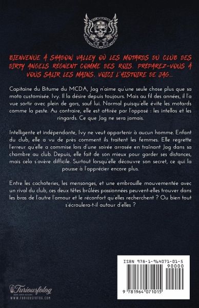 Bienvenue à Shadow Valley où les motards du club des Dirty Angels règnent comme des rois. Préparez-vous à vous salir les mains, voici l'histoire de Jag... Capitaine du Bitume du MCDA, Jag n'aime qu'une seule chose plus que sa moto customisée. Ivy. Il la désire depuis toujours. Mais au fil des années, il l'a vue sortir avec plein de gars, sauf lui. Normal puisqu'elle évite les motards comme la peste. Au contraire, elle est attirée par l'opposé : les intellos et les ringards. Ce que Jag ne sera jamais. Intelligente et indépendante, Ivy ne veut appartenir à aucun homme. Enfant du club, elle a vu de près comment ils traitent les femmes. Elle regrette l'erreur qu'elle a commise lors d'une soirée arrosée en traînant Jag dans sa chambre au club. Depuis, elle fait de son mieux pour garder ses distances, mais cela s'avère difficile. Surtout lorsqu'elle découvre son secret, ce qui la pousse à l'apprécier encore plus. Entre les cachoteries, les mensonges, et une embrouille mouvementée avec un rival du club, ces deux têtes brûlées passionnées peuvent-elles trouver dans les bras de l'autre l'amour et le réconfort qu'elles recherchent ? Ou bien tout s'écroulera-t-il autour d'elles ? Note : Down & Dirty : Jag est le deuxième livre de la série sur le club de motos des Dirty Angels. Il est fortement recommandé que vous lisiez la série de 10 livres dans l'ordre. Il n'y a ni infidélité ni suspens dans les relations, qui ont toujours une fin heureuse.
