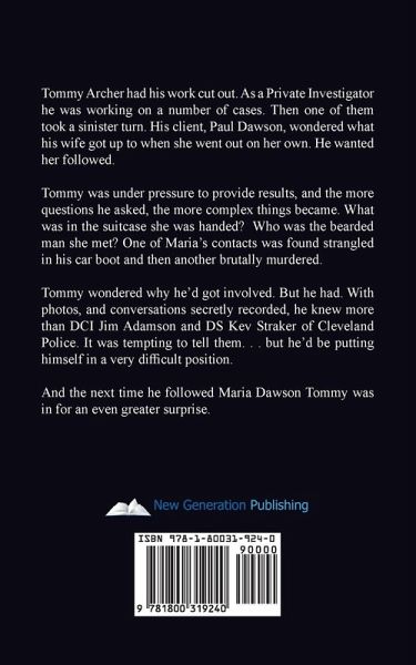 Tommy Archer had his work cut out. As a Private Investigator he was working on a number of cases. Then one of them took a sinister turn. His client, Paul Dawson, wondered what his wife got up to when she went out on her own. He wanted her followed. Tommy was under pressure to provide results, and the more questions he asked, the more complex things became. What was in the suitcase she was handed? Who was the bearded man she met? One of Maria's contacts was found strangled in his car boot and then another brutally murdered. Tommy wondered why he'd got involved. But he had. With photos, and conversations secretly recorded, he knew more than DCI Jim Adamson and DS Kev Straker of Cleveland Police. It was tempting to tell them. . . but he'd be putting himself in a very difficult position. And the next time he followed Maria Dawson Tommy was in for an even greater surprise.
