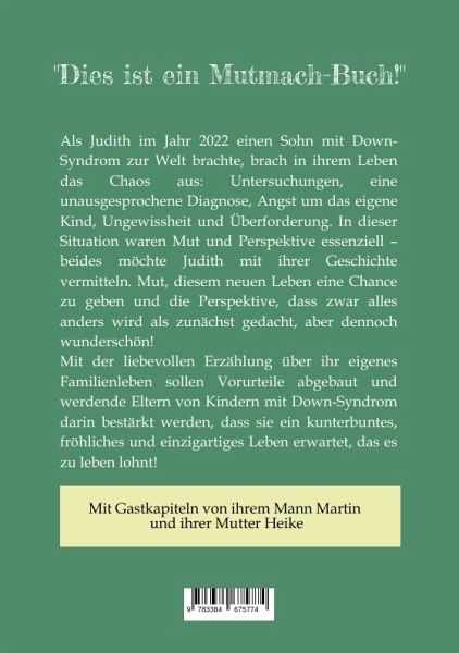Die Autorin beschreibt auf feinfühlige Art ihren Familienalltag mit einem behinderten Kind. Ihr Sohn kam 2022 überraschend mit Down-Syndrom (Trisomie 21) zur Welt, was Judiths Leben auf den Kopf stellte. Wie sie die erste Zeit im Krankenhaus erlebte, Frieden mit der Diagnose schloss und wie ihr Leben mittlerweile aussieht, hat sie in ihrem Buch "Down about nothing" auf wundervolle Art festgehalten. Damit möchte sie vor allem werdenden Eltern von Kindern mit Down-Syndrom Mut machen und eine Perspektive geben: dass sich das eigene Leben vielleicht anders entwickelt als gedacht, aber deshalb nicht weniger schön ist. Mit viel Liebe und sehr authentisch führt sie uns einen kleinen Jungen vor Augen, der in seinem Leben bereits viel kämpfen musste, aber ein unvergleichliches Maß an Lebensfreude hat, die auf alle anderen Menschen abfärbt.