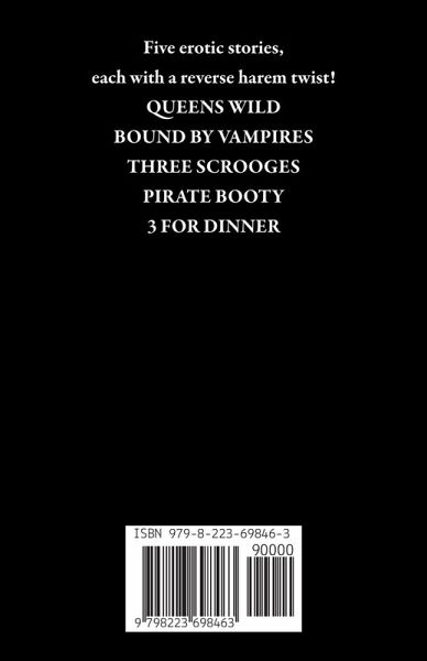 Reverse harem romance with three or more partners, ropes, chains, and whipped cream, alpha vampires, hot outlaws, and pirates. Everything you need to tickle your erotic short story itch! QUEENS WILD: Rose was furious when her boyfriend wagered her in a poker game, but the victors won't let her be upset for long. RH revenge bet erotica featuring a cowboy, a mafia man, and a burly alpha. BOUND BY VAMPIRES: Alpha vampires need a queen... and they'll do anything to keep her. Paranormal why-choose romance with a BDSM twist. THREE SCROOGES: Lexi's looking forward to her first Christmas alone, but three handsome intruders have other ideas. This Christmas, she'll show them exactly what she wants... even if it takes all night. PIRATE BOOTY: If you're a fan of hot as heck outlaw pirates, forced proximity, bondage, and steamy group scenes, "Pirate Booty" is the erotic short story for you! 3 FOR DINNER: Sensual food, three sexy chefs, and a group erotic romance experience to remember. The only question is who gets to eat the cherry.