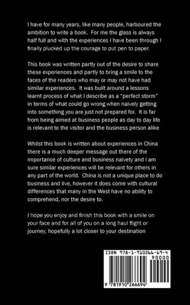 I have for many years, like many people, harboured the ambition to write a book. For me the glass is always half full and with the experiences I have been through I finally plucked up the courage to put pen to paper. This book was written partly out of the desire to share these experiences and partly to bring a smile to the faces of the readers who may or may not have had similar experiences. It was built around a lessons learnt process of what I describe as a "perfect storm" in terms of what could go wrong when naively getting into something you are just not prepared for. It is far from being aimed at business people as day to day life is relevant to the visitor and the business person alike. Whilst this book is written about experiences in China there is a much deeper message out there of the importance of culture and business naivety and I am sure similar experiences will be relevant for others in any part of the world. China is not a unique place to do business and live, however it does come with cultural differences that many in the West have no ability to comprehend, nor the desire to. I hope you enjoy and finish this book with a smile on your face and for all of you on a long haul flight or journey, hopefully a lot closer to your destination.