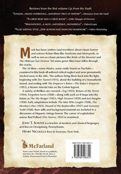 Much has been written (and rewritten) about classic horror and science fiction films like Nosferatu and Metropolis, as well as not-so-classic pictures like Bride of the Monster and The Hideous Sun Demon. Yet some genre films have fallen through the cracks. The 24 films--some elusive, some easily found on YouTube--examined in this book all suffered critical neglect and were prematurely stacked in the attic. The authors bring them back into the light, beginning with Der Tunnel (1915), about the building of a transatlantic tunnel, and ending with The Emperor's Baker--The Baker's Emperor (1951), a bizarre Marxist take on the Golem legend. A variety of thrillers are covered--Fog (1933), Return of the Terror (1934), Forgotten Faces (1928)--along with such sci-fi leaps into the future as The Sky Ranger (1921), High Treason (1929) and Just Imagine (1930). Early adaptations include The Man Who Laughs (1921), The Monkey's Paw (1923), Hound of the Baskervilles (1937) and Sweeney Todd (1928). Rare stills and background material are included in a discussion of Hispanic vintage horror. The career of exploitation auteur, Bud Pollard (The Horror, 1933) is examined.