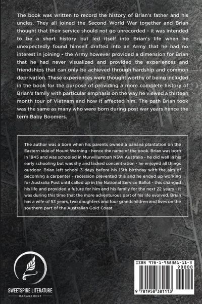 This book traces the path of a young man born immediately after the Second World War and classified throughout the world as a Baby Boomer. Brian was a borderline failure at school but worshipped the outdoors and in particular his close mates - these attributes served him well when he was unexpectedly drafted into a two year National Service Scheme created to meet the demands of the Vietnam war. Brian served a thirteen month tour of Vietnam as an Infantry Platoon Commander with an Australian Infantry Battalion and spent forty weeks of his tour in the field - his life was threatened on many occasions but he came out of Vietnam with a greater understanding of his own strengths and weaknesses and a full understanding of the Australian psyche - the friends he made in Vietnam remain his friends today. Brian also was able to take his family on postings to Darwin, Hong Kong and Brunei which strengthened his children's knowledge of a much bigger world and gave them an insight into the riches we share in Australia. Brian used his military knowledge and background to help him raise funds for his local surf club and restore the presence and dignity of a local RSL - a tough life but not an unhappy one.
