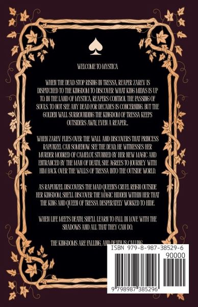 Welcome to Mystica When the dead stop rising in Tressa, Reaper Zarev is dispatched to the kingdom to discover what King Midas is up to. In the land of Mystica, Reapers control the passing of souls. To not see any dead for decades is concerning. But the golden wall surrounding the kingdom of Tressa keeps outsiders away, even a Reaper... Zarev flies over the wall and discovers that princess Rapunzel can somehow see the dead, he witnesses her murder Modred of Camelot. Stunned by her new magic and entranced by the man of death, she agrees to journey with him back over the walls of Tressa into the outside world. As Rapunzel discovers the Mad Queen's cruel reign outside her kingdom, she'll discover the magic hidden within her that the King and Queen of Tressa desperately worked to hide. When life meets death, she'll learn to fall in love with the shadows and all that they can do. Down from the Tower is book 1 in the Deadly Endings series. All books are set in the land of Mystica. Full list of triggers inside and on my web site.