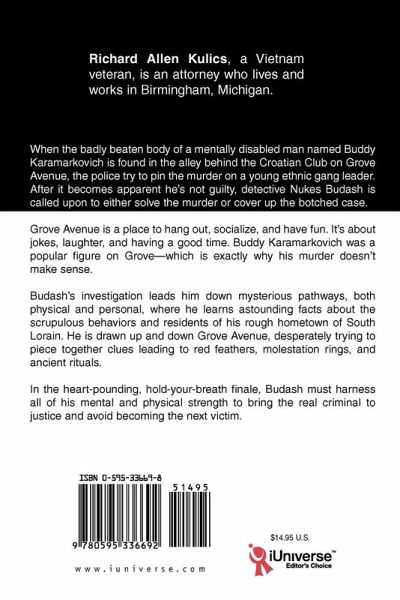 When the badly beaten body of a mentally disabled man named Buddy Karamarkovich is found in the alley behind the Croatian Club on Grove Avenue, the police try to pin the murder on a young ethnic gang leader. After it becomes apparent he's not guilty, detective Nukes Budash is called upon to either solve the murder or cover up the botched case. Grove Avenue is a place to hang out, socialize, and have fun. It's about jokes, laughter, and having a good time. Buddy Karamarkovich was a popular figure on Grove--which is exactly why his murder doesn't make sense. Budash's investigation leads him down mysterious pathways, both physical and personal, where he learns astounding facts about the scrupulous behaviors and residents of his rough hometown of South Lorain. He is drawn up and down Grove Avenue, desperately trying to piece together clues leading to red feathers, molestation rings, and ancient rituals. In the heart-pounding, hold-your-breath finale, Budash must harness all of his mental and physical strength to bring the real criminal to justice and avoid becoming the next victim.