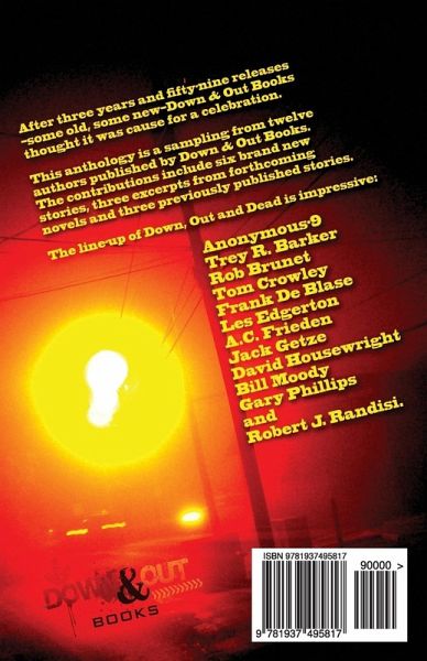 After three years and fifty-nine releases-some old, some new-Down & Out Books thought it was cause for a celebration. This anthology is a sampling from twelve authors published by Down & Out Books. The contributions include six brand new stories, three excerpts from forthcoming novels and three previously published stories. The line-up of Down, Out and Dead is impressive-Anonymous-9, Trey R. Barker, Rob Brunet, Tom Crowley, Frank De Blase, Les Edgerton, A.C. Frieden, Jack Getze, David Housewright, Bill Moody, Gary Phillips and Robert J. Randisi.
